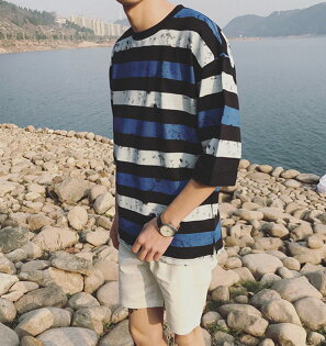 韓國 FINDSENSE品牌 條紋 上衣 七分袖 男 並提供加大尺碼 加肥 大 男裝