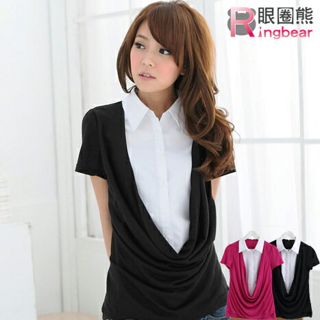 出自:線上購物分享 - 假兩件--專屬女性的OL魅力垮領抓皺假兩件襯衫(黑.桃M-2L)-H100眼圈熊中大尺碼